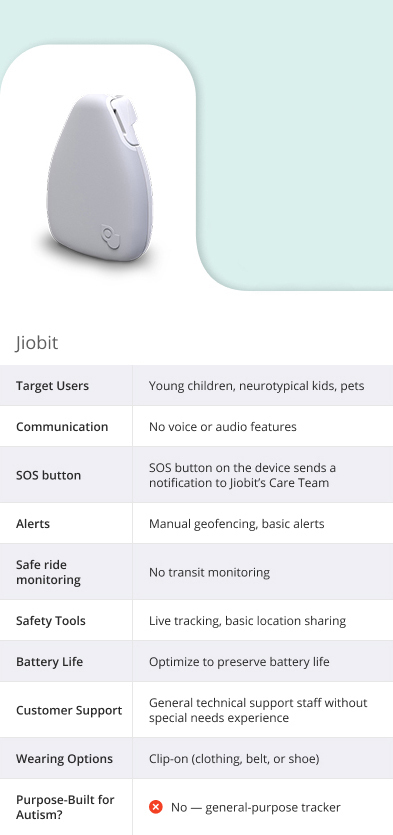Jiobit has no voice communication capabilities — a critical gap in emergency situations where every second matters and your child will be unable to get immediate support.