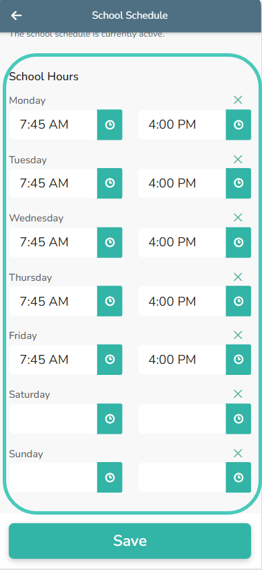 4. In the “School hours” section, click on the clock icon to enter in the time school starts and ends for each day. This gives you the ability to have different start and end times for different days.