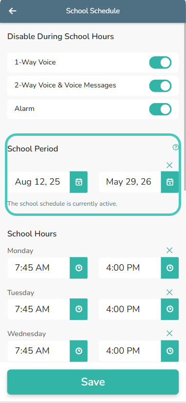 2. Select which features you will need to have disabled during school hours; 1-Way Voice, 2-Way Voice, and Alarm.