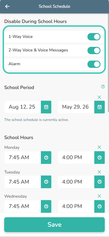 In order to enable 1-Way Voice, 2-Way Voice, Voice Messages, or Alarm during the school day if you have a school schedule set and the editing ability has been removed per agreement, a school guardian must email schools@angelsense.com and call us to enable at for an emergency or if the child is home from school. If there is an ability to edit per the school agreement, a Primary Guardian or School Guardian with access to the School Schedule would need to take the following Steps: