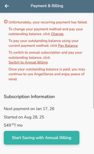 Here is some guidance if you are getting a pop-up in your app regarding having “Recurring Payment Failure”