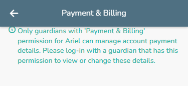 NOTE: If you are receiving the message of being a Guardian that does not have permission to manage account payment details, then you are not a Primary Guardian. Please have a Primary Guardian add you as such in order to manage account payment details. Adding Primary Guardians