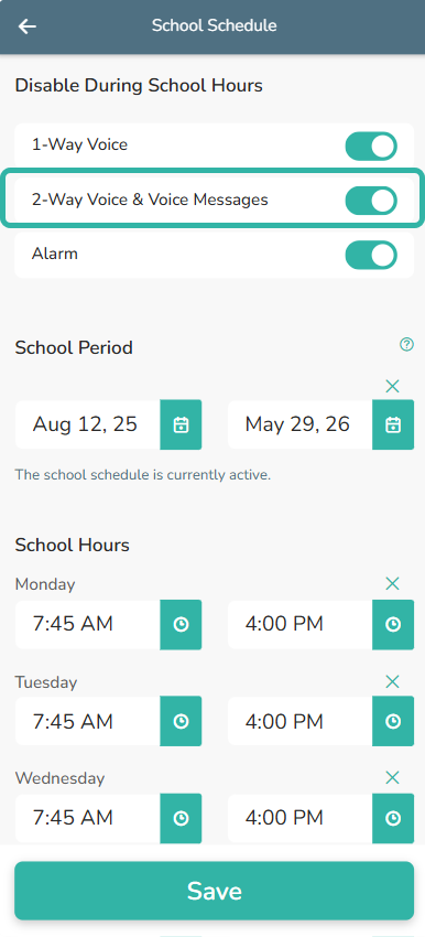 Voice messages will not play during school hours if ‘2-Way Voice & Voice Messages’ is disabled with School Hours set, as shown below.