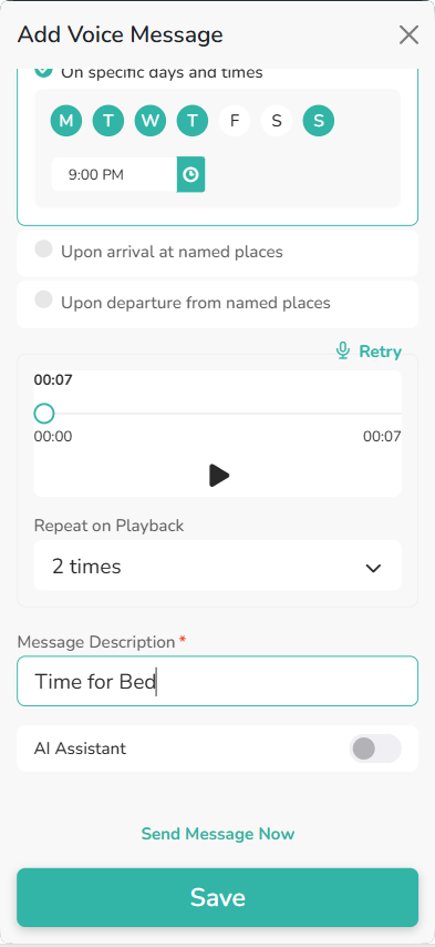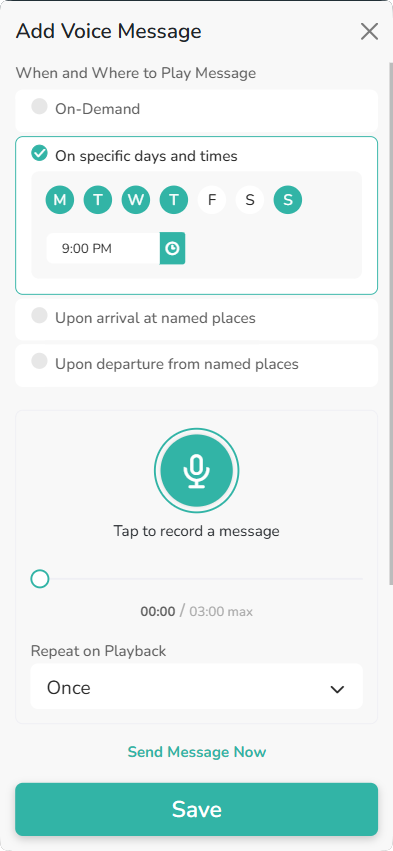 Record Voice Messages and play them remotely on your loved one’s AngelSense device on-demand, or automatically at the time or location that you predefine.