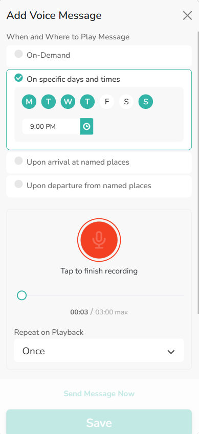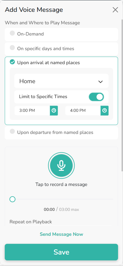 - This option allows you to send the recorded message when the devices arrives at a specific named place. You can also limit it to only send during certain time periods.