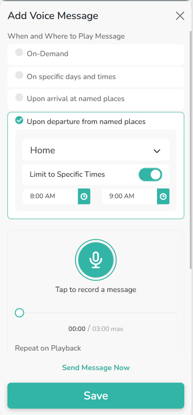 - This option allows you to send the recorded message when the devices leaves from a specific named place. You can also limit it to only send during certain time periods.